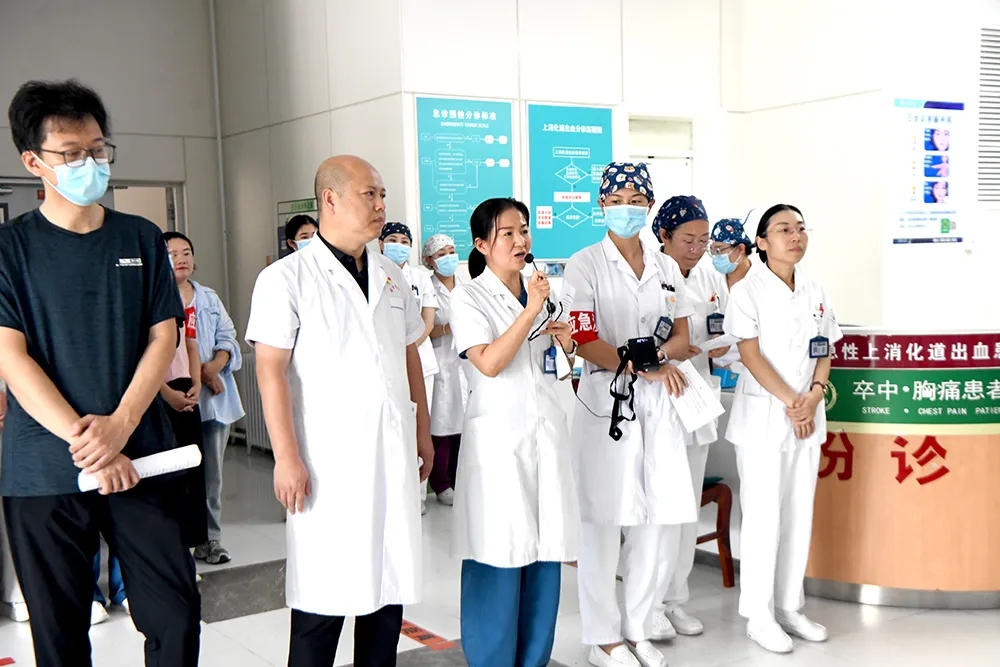 为全面提升突发公共事件应急响应能力,我院围绕“实战化、精准化、协同化”目标,于9月3日下午在急诊科组织开展雷暴哮喘批量患者救治现场实战演练及院内非正常死亡事件(如坠楼、突发事故)桌面推演。演练前,医院多次组织召开筹备会、彩排,强调“演练即实战,细节定成败”。院办(应急办)、医务部、护理部、急诊科、保卫科等相关科室,结合事件特点细化方案:针对雷暴哮喘演练,重点打磨预检分诊、分级救治流程,备齐备足平喘药品及呼吸机等急救设备;针对院内非正常死亡事件桌面推演,反复梳理信息上报、多部门联动等关键环节,确保人人熟悉流程、个个明确职责。