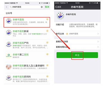 2.微信公众号 在微信公众号中搜索:赤峰市医院,点击关注即可