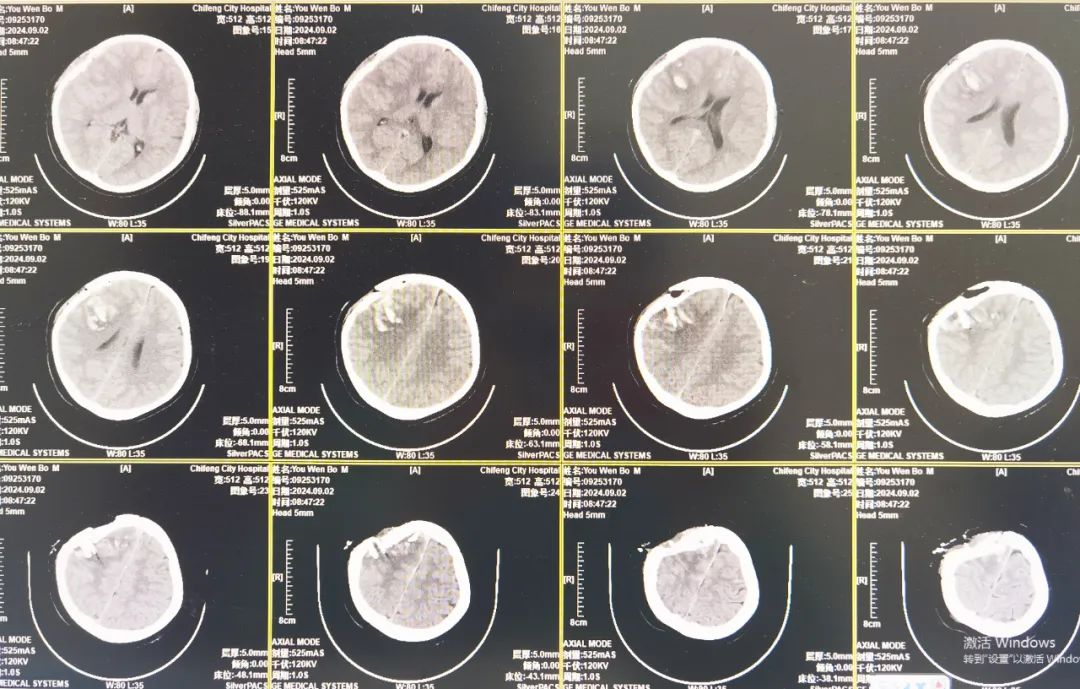 紧急时刻,120急救车将男孩送至首都医科大学宣武医院内蒙古医院。来院时,男孩意识模糊、痛苦呻吟、躁动明显,头部有长度约 20 余公分皮裂伤,创面污浊,颅骨凹陷粉碎骨折,局部骨碎片嵌插入颅内,脑组织外溢。