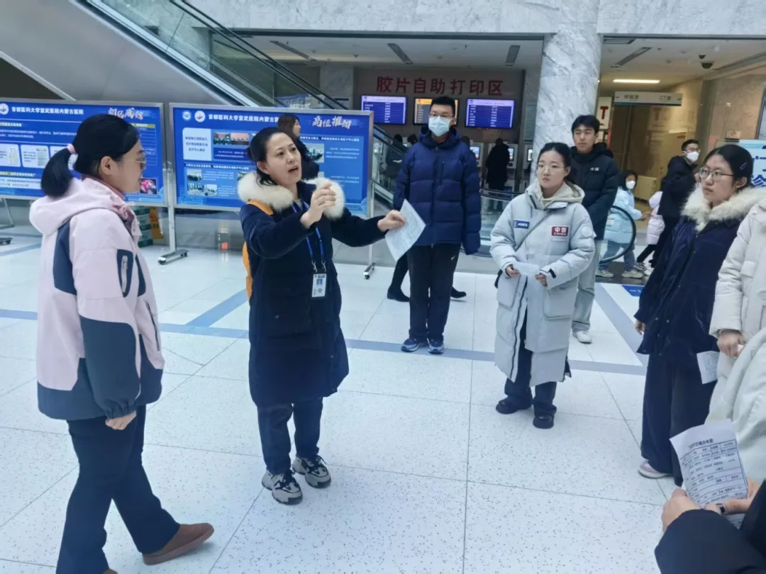 张文红带领大家进行医院实地培训,大学生们跟随着经验丰富的前辈脚步,熟悉门诊楼、急诊楼的环境布局,学习导医经验,在掌握导医技能后,便迫不及待地投入工作,协助病患挂号缴费,维持队伍秩序,用热情温暖寒冷的冬季。