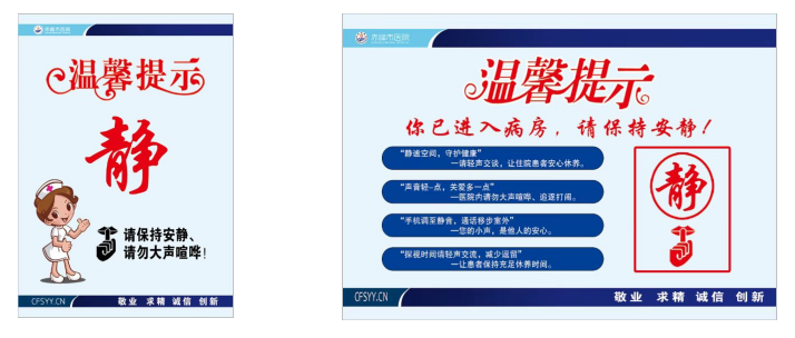 每个病房门口及病房的墙上,都贴着一张精心设计的“温馨提示贴”。淡蓝色的背景上,一只手指轻轻抵在唇边,是大家熟悉的“嘘”手势,仿佛在温柔提醒:“这里需要安静哦”;旁边则是醒目的“静”字,笔触圆润柔和,没有生硬的命令感,反倒像一句贴心的叮嘱。这张小小的提示贴,成了病房门口的“无声管家”,无论是医护人员查房、家属探望,还是保洁阿姨清洁,看到它都会下意识放轻动作、降低音量,让“安静”成为每个人的默契。
