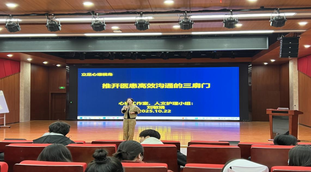 为提升实习生医患沟通能力与人文素养,10月22日,心理工作室、人文护理小组老师为全体实习生开展了一场题为“心理视角下:推开医患高效沟通的三扇门”的赋能讲座。活动从心理学视角出发,系统讲解沟通理念与方法,助力实习生实现职业成长。